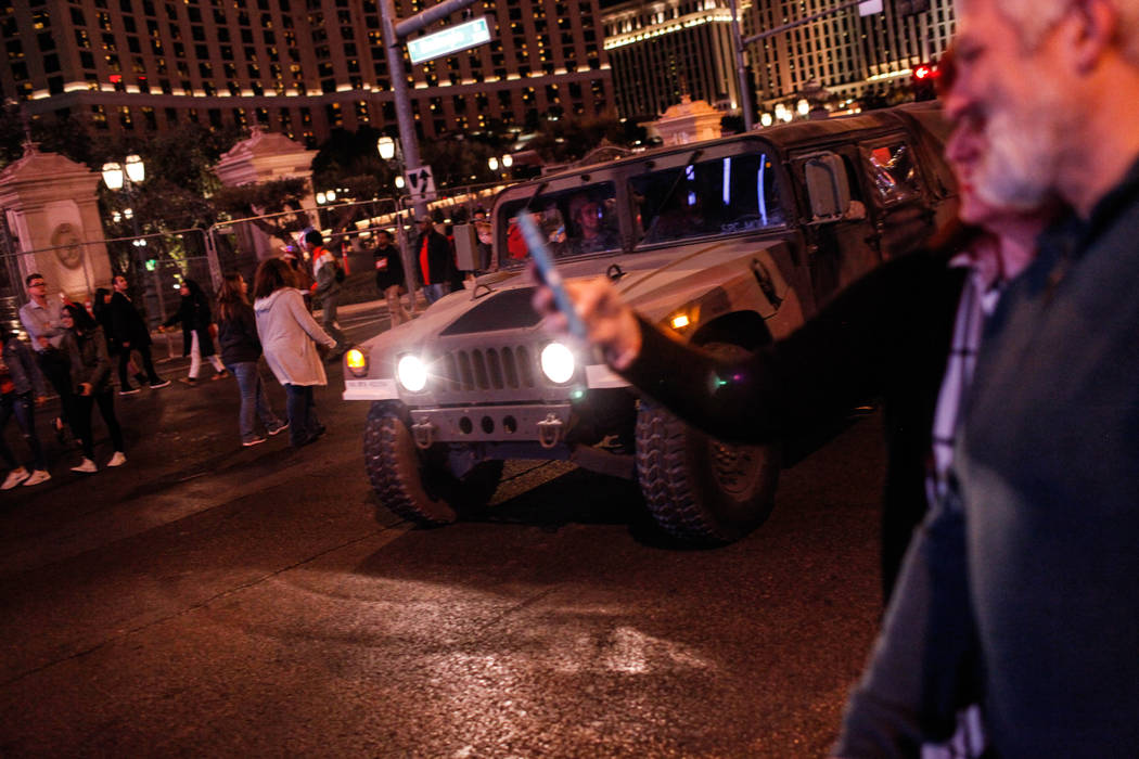 By 6 p.m., all roads leading into the resort corridor had shut down. The 3-mile stretch from Mandalay Bay to the SLS was closed to vehicles and fully open to pedestrians by about 6:45. RTC buses were used as barricades to block several major streets leading to the Strip, as drones and helicopters patrolled overhead.