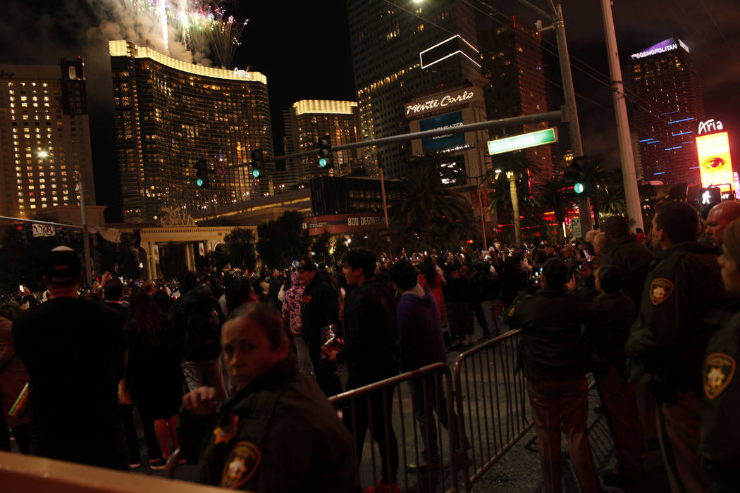 A crowd of 330,000 visitors was expected to fill the Strip and Fremont Street downtown, as a record contingent of law enforcement officers kept the peace.