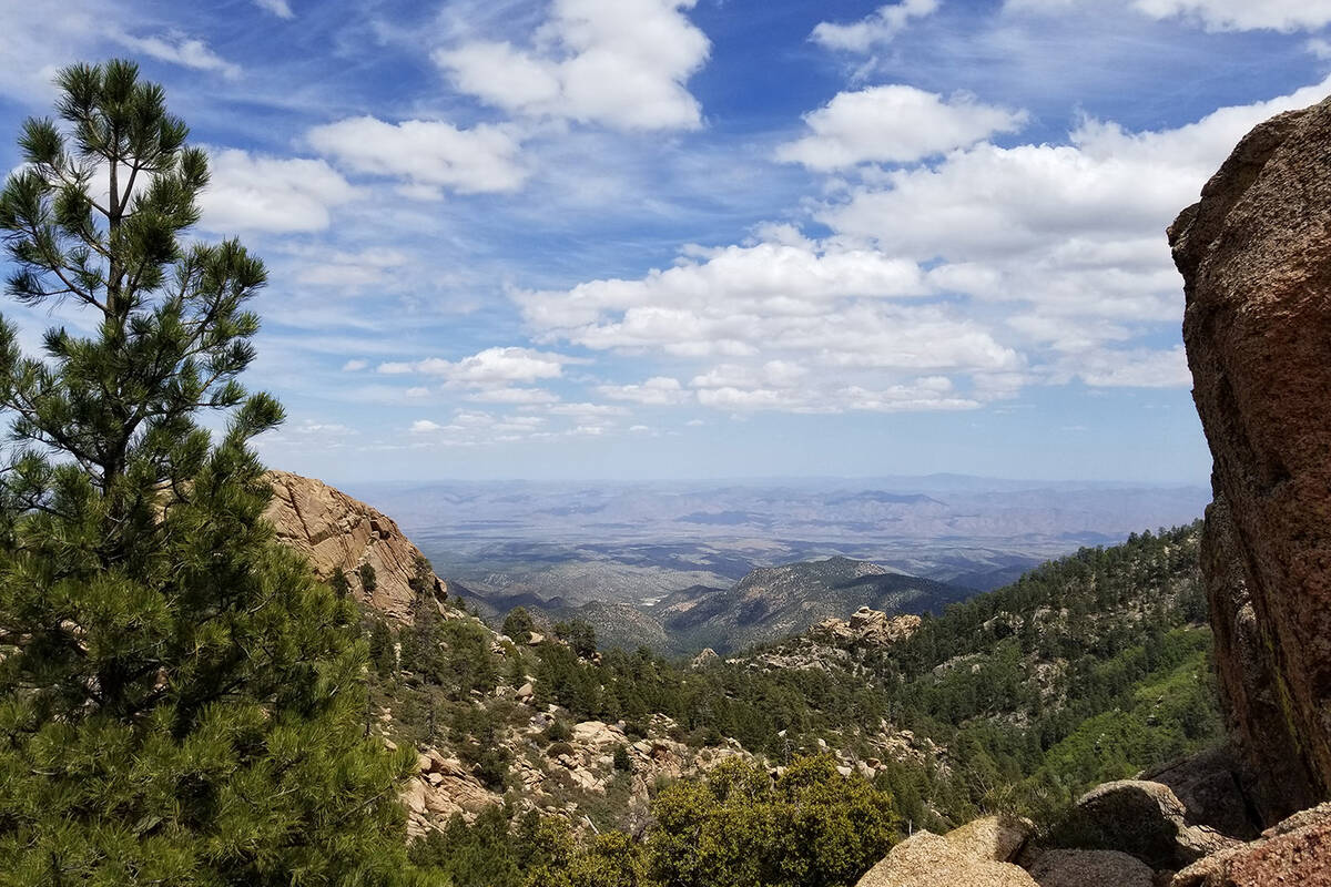Ultimately, Potato Patch Loop circles Aspen Peak, one of the park’s craggy summits above 8,000 feet. The trail has 6,000- and 7,000-foot elevations and continues through ponderosa and pinyon pines, juniper, Gambel oak, manzanita and cliffrose. A summer big-sky day might include unthreatening clouds floating above the Hualapai Mountains, which are named for “people of the tall pines” in the Hualapai language.