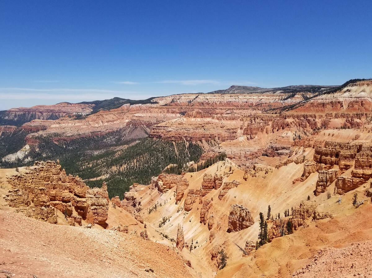 When a day trip has the potential to become an overnighter, consider the South Rim Trail at Cedar Breaks National Monument in Southern Utah. About 200 miles and four hours away from Las Vegas, this trail offers the finest way to appreciate a half-mile-deep geologic amphitheater with an eclectic assortment of red, orange, pink and white formations that include hoodoos, fins and arches.
