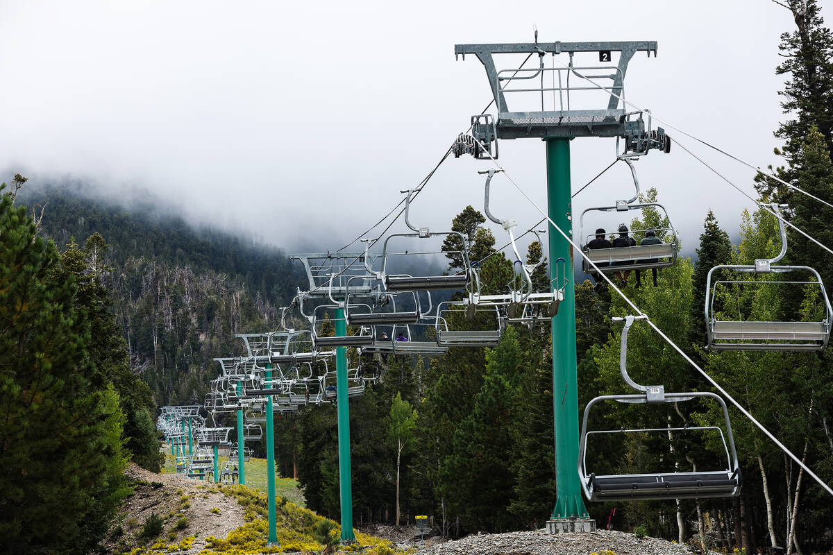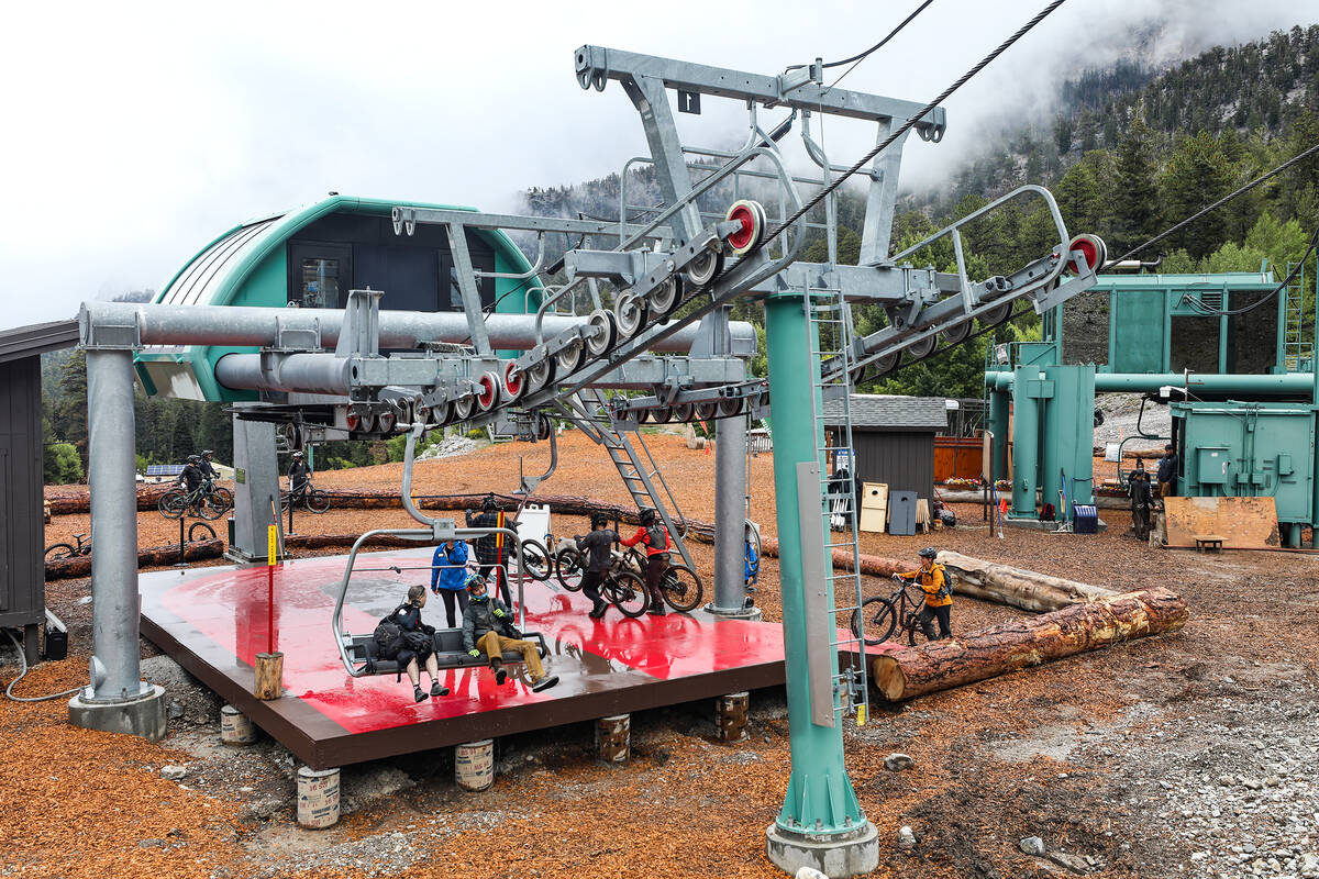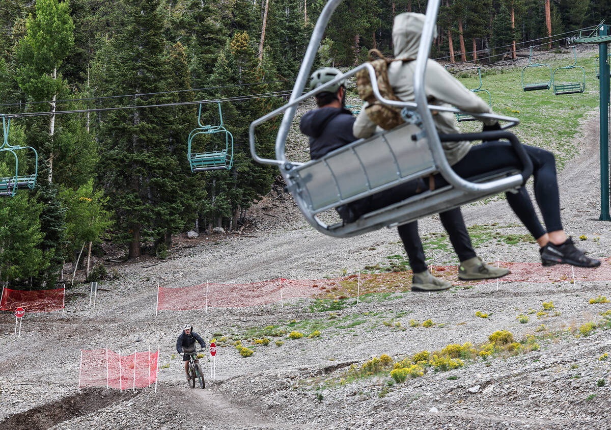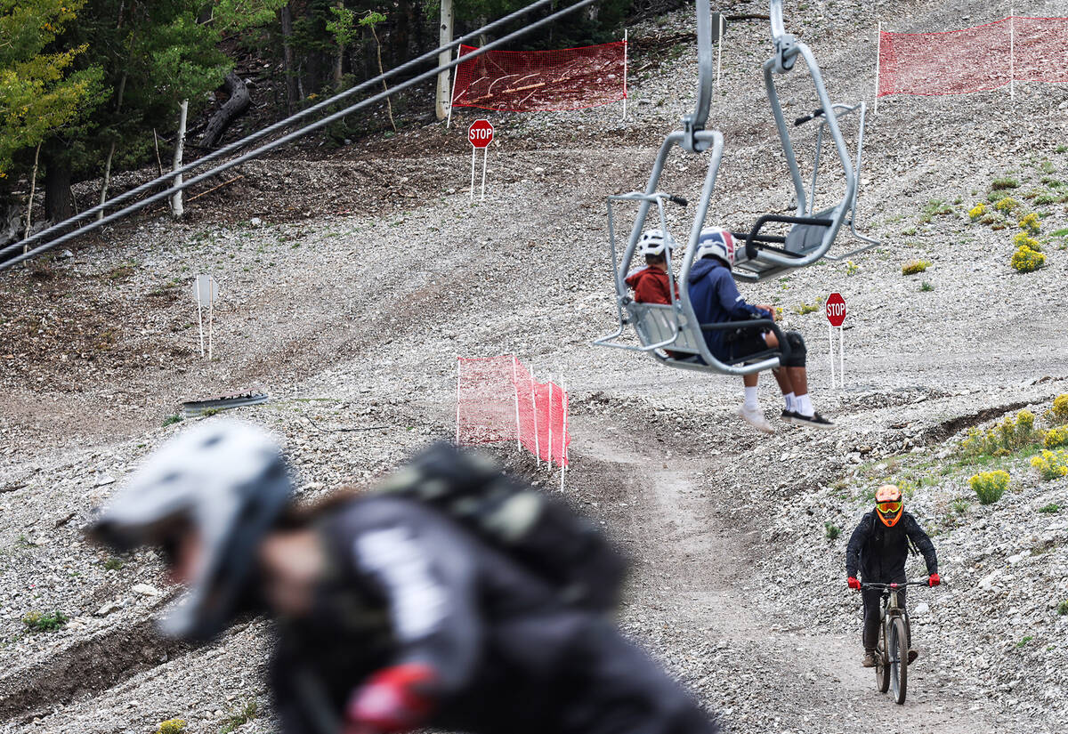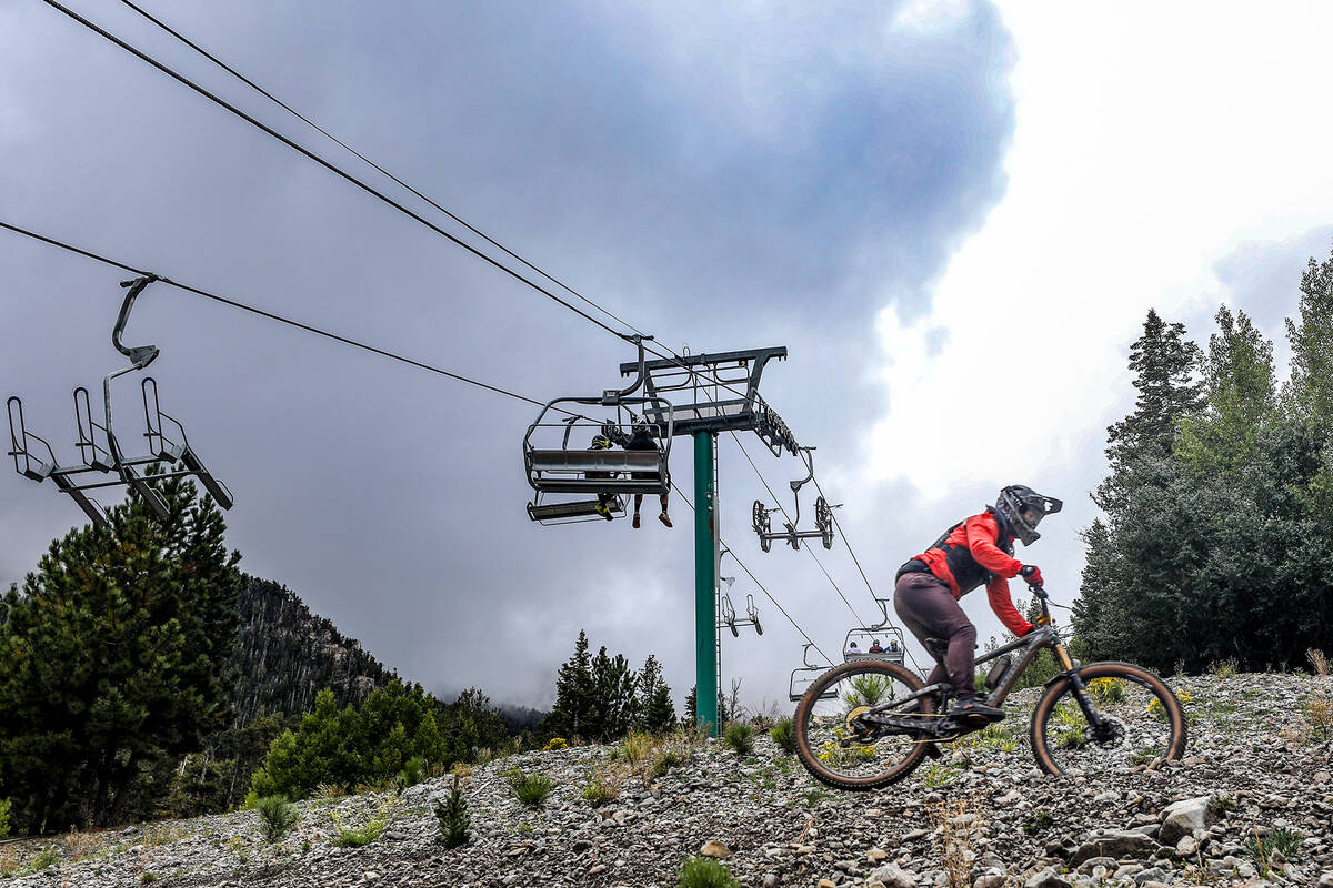 Bicyclists take the ski lift up to ride down paths as part of the downhill mountain bike park at Lee Canyon resort in Las Vegas, Monday, Sept. 12, 2022. (Rachel Aston/Las Vegas Review-Journal) @rookie__rae