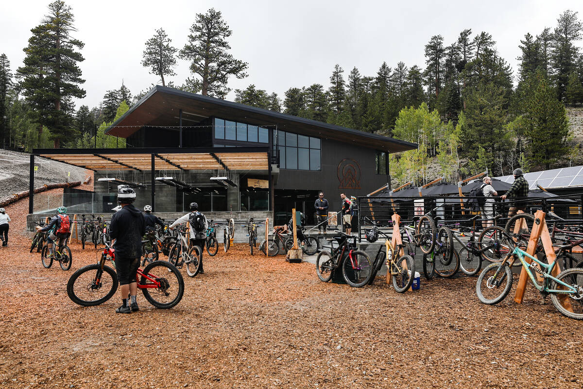 Bicyclists hang out near the restaurant and downhill mountain bike park at Lee Canyon resort in Las Vegas, Monday, Sept. 12, 2022. (Rachel Aston/Las Vegas Review-Journal) @rookie__rae