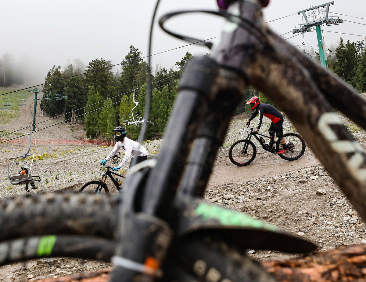 Bicyclists ride down a path at the downhill mountain bike park at Lee Canyon resort in Las Vegas, Monday, Sept. 12, 2022. (Rachel Aston/Las Vegas Review-Journal) @rookie__rae