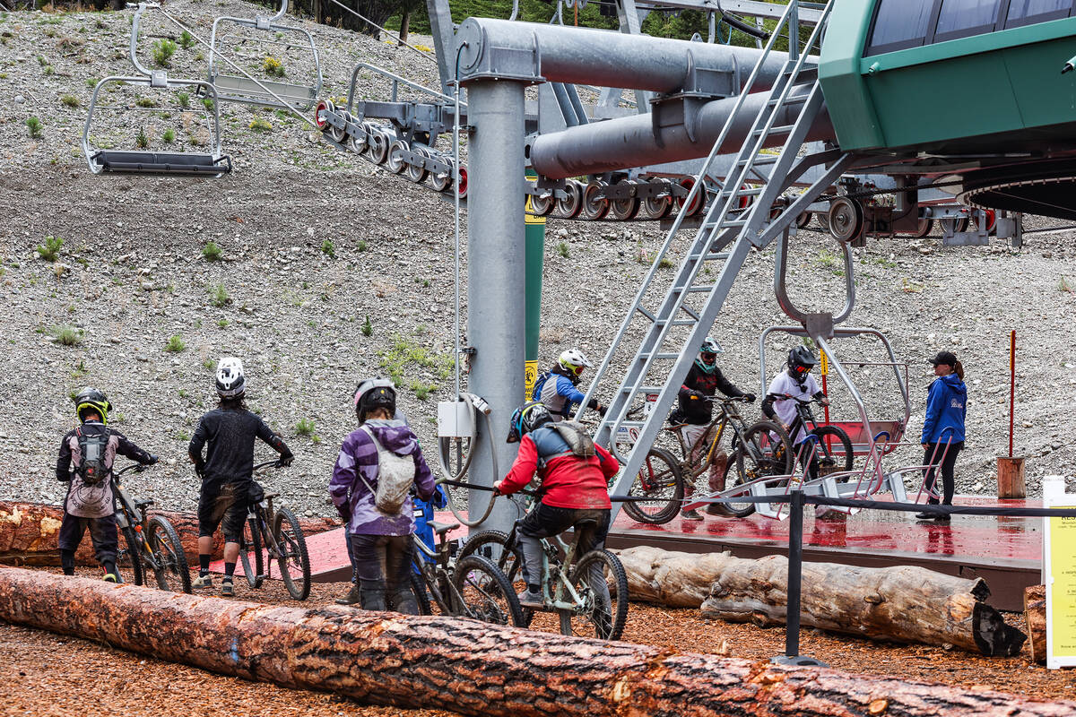 Bicyclists wait to take the ski lift up the mountain at the downhill mountain bike park at Lee Canyon resort in Las Vegas, Monday, Sept. 12, 2022. (Rachel Aston/Las Vegas Review-Journal) @rookie__rae