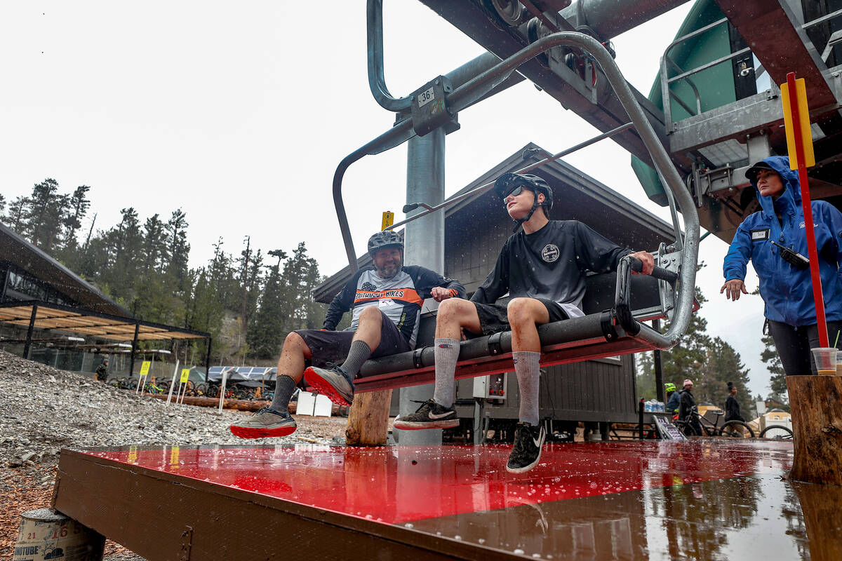 Spencer Dunsmoor, left, and his son Ethan Dunsmoor, right, hop on the ski lift at the downhill mountain bike park at Lee Canyon resort in Las Vegas, Monday, Sept. 12, 2022. (Rachel Aston/Las Vegas Review-Journal) @rookie__rae