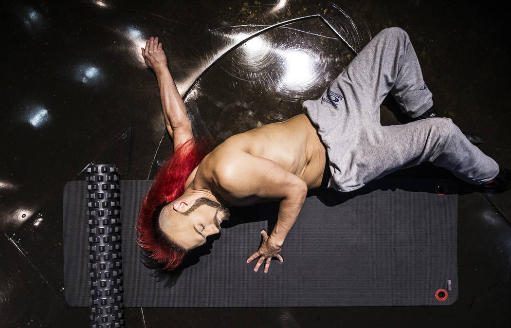 Now, there are days when he needs a doctor. Which is understandable, considering what he does for a living: hanging from a chain, high above a showroom stage, suspended by his arms, his back, his heels, his chin.