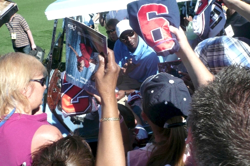 Then the towering legend drove his cart to a swollen pack of 100 or so fans and autograph sellers, who were holding Sports Illustrated magazines and Air Jordan shoes. Brazen.