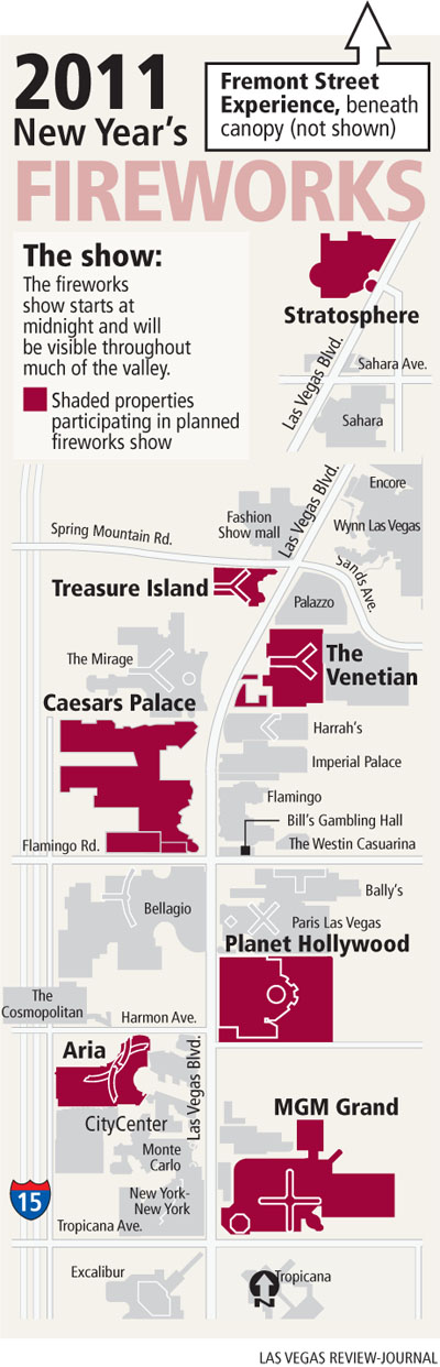 America’s Party 2011, the largest New Year’s Eve celebration west of the Mississippi River, will feature 8 minutes and 6 seconds of fireworks blasting from atop seven hotels along the three-mile Strip.