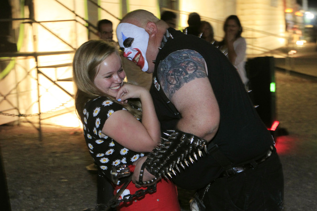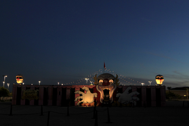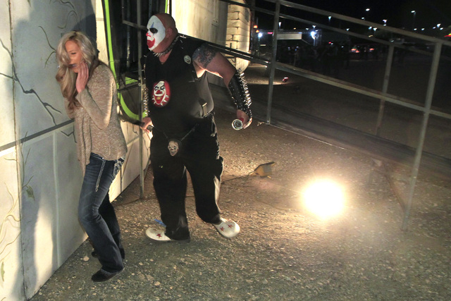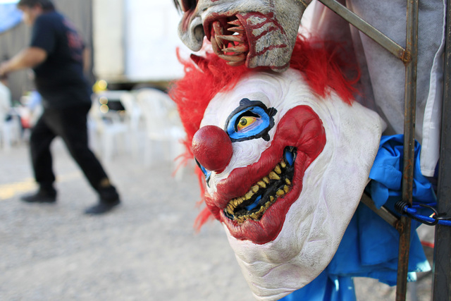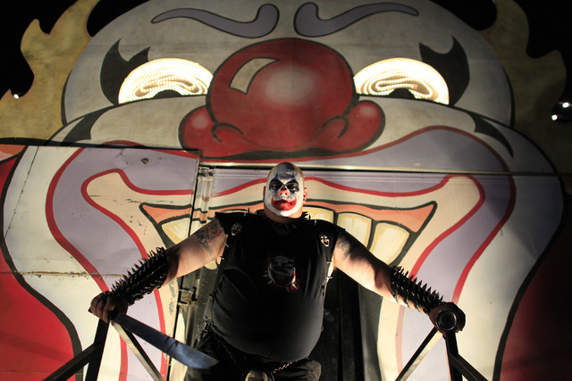 Scorch, a fire-breathing, demented clown for Freakling Bros. Trilogy of Terror at 4245 S. Grand Canyon Drive, along with another ghoulish character spend each night circling outside the three houses scaring all who are waiting.