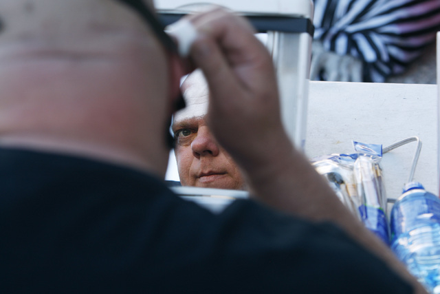 Sitting in the back trailer behind one of the houses, Ross begins the process of applying his makeup for the opening night of Trilogy of Terror.