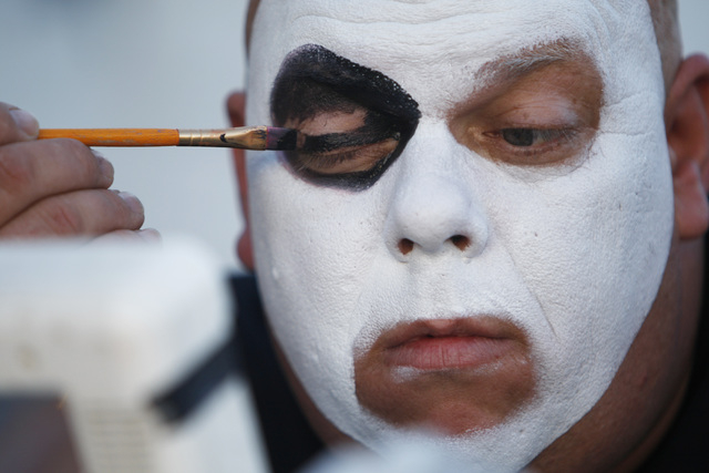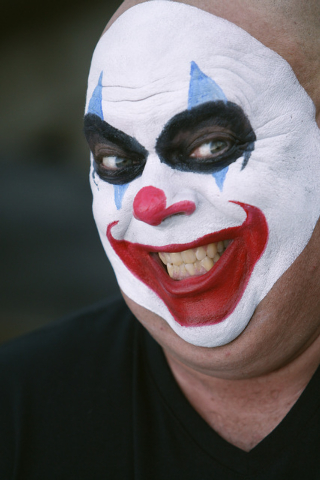 After his face is covered with a base of white makeup, he applies the giant red smile and then starts working on the eyes.