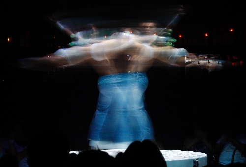 There are no names for their movements, just descriptions. In one, Jenny links her hands behind Victor's neck and he spins her until her feet are off the ground. He spins her by an arm and a leg, by her ankles and then by a rope around the neck. The rope is the only thing holding her to him and, to add to the effect, she twirls while he spins her.