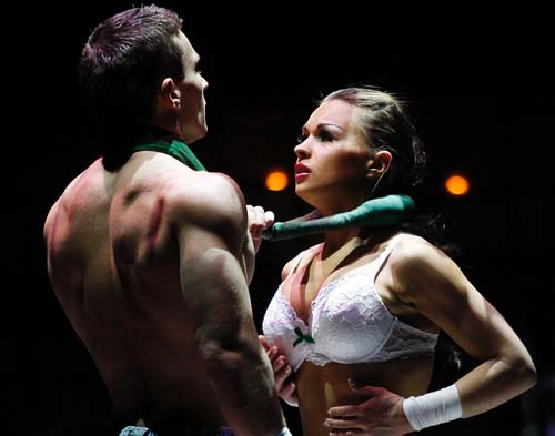For six minutes, this perfect couple, he muscular and chiseled, she soft but strong, holds the "Absinthe" audience hostage with their dramatic stunts, each more astonishing than the one before.