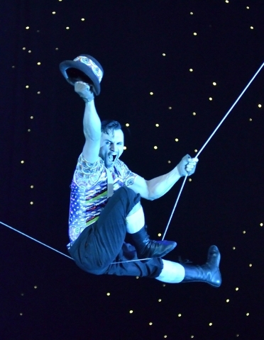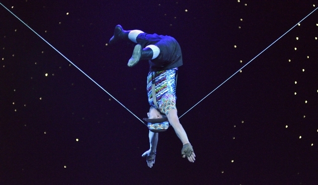 There are solid ideas in making the zipline the context for a stranded “slack line” acrobat (Evgeny Vasilenko), or the buffet kitchen a place for Michael Goudeau — who co-wrote the show — to offer a brief encore of the apple juggling he did for years with Lance Burton.