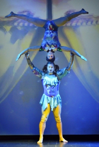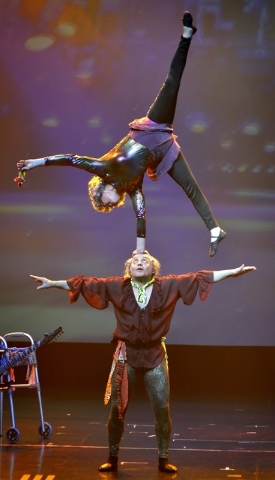 But too much of it turns into the Cirque-light acrobatics it’s supposed to be an alternative to. Beyond the KriStef Brothers, we get still more balancing, a trapeze and a hoop act (from Ekaterina Arnaoutavoa, Izzy and Sasha Pivaral). A promising joke about aging boomers and their till-death devotion to classic rock turns into still another balancing act with chairs (from Nelson and Goulia Pivaral).