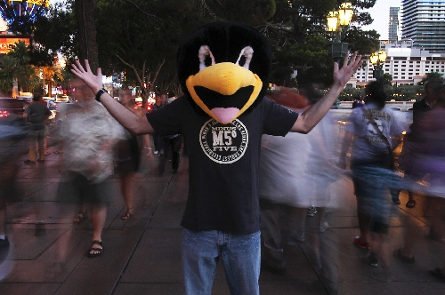Since he worked at a Strip casino, he was familiar with the costumed characters and thought, after losing his job, that he could make some fast cash by joining them. He chose his costume because it was original, Larry says, and because he had a penguin suit left over from Halloween.