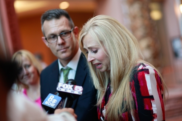 Paula Stokes-Richards, whose sister, Shauna Tiaffay, was murdered by a homeless man hired by her husband George Tiaffay, speaks with news media following the verdict declaring Tiaffay guilty of 1st degree murder and other charges at the Regional Justice Center in Las Vegas on Thursday, Sept. 3, 2015. Stokes-Richards‘ husband, John Richards, stands left. Chase Stevens/Las Vegas Review-Journal Follow @csstevensphoto
