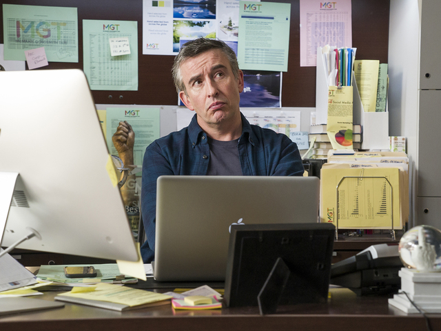 Despite some interesting insights into aging and happiness — Hoffman’s replacement, Steve Coogan, is told he may just have a low “joy ceiling” — the off-puttingly dark comedy is hamstrung by a lazy coarseness.