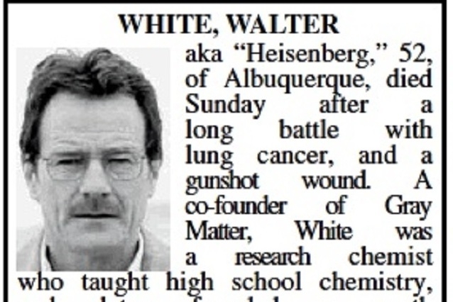 ALBUQUERQUE, N.M. — Some fans of “Breaking Bad,” the AMC series which concluded Sunday night, were inspired to place an obituary for character Walter White in the Albuquerque Journal.