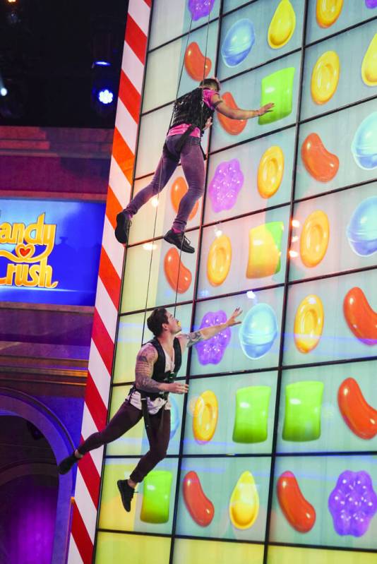 One wall is placed horizontally on the stage floor, the other is perpendicular to it, and players in safety harnesses scoot across and up and down the screens. They make candy matches by, natch, swiping squares a la the mobile game.