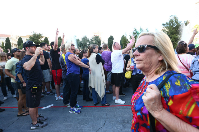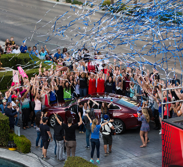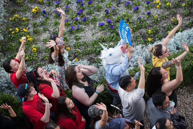 Silver and blue confetti rained over the hundreds standing on Las Vegas Boulevard, and the crowd erupted in cheers.