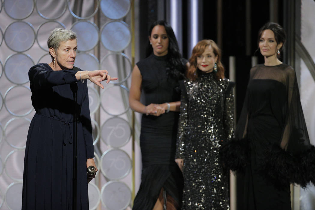 Sunday night’s black-clad demonstration was promoted by the recently formed Time’s Up: an initiative of hundreds of women in the entertainment industry —including Streep, Williams, Dern and Winfrey — who have banded together to advocate for gender parity in executive ranks and legal defense aid for sexual harassment victims.