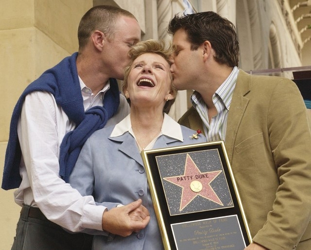 Award-winning actress Patty Duke receives a kiss from sons, MacKenzie, left, and Sean Astin following an unveiling ceremony honoring Duke with the 2,260th star on the Hollywood Walk of Fame in Los Angeles, Aug. 17, 2004. Duke has passed away at the age of 69, according to news reports. (Jim Ruymen/Reuters)