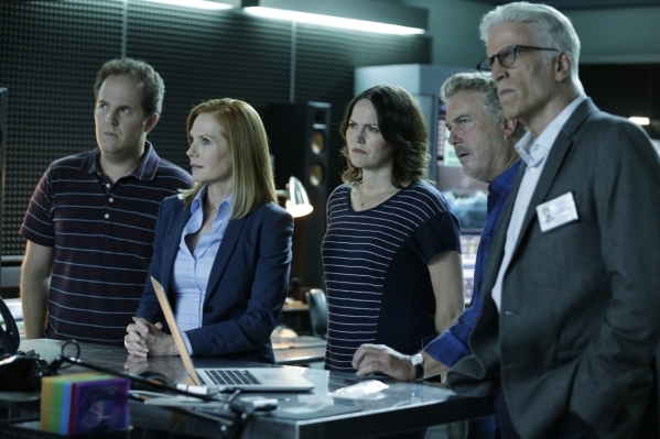 From left, David Berman, Marg Helgenberger, Jorja Fox, William Petersen and Ted Danson appear in a scene from the two-part series finale. (Sonja Flemming/CBS)