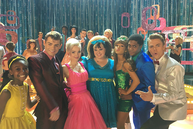 HAIRSPRAY LIVE! — Pictured: (l-r) Shahadi Wright Joseph as Little Inez, Garrett Clayton as Link Larkin, Dove Cameron as Amber Von Tussle, Maddie Baillio as Tracy Turnblad, Ariana Grande as Penny Pingleton, Ephraim Skyes as Seaweed J. Stubbs, Derek Hough as Corny Collins — (Photo by: Maddie Baillio/NBC)